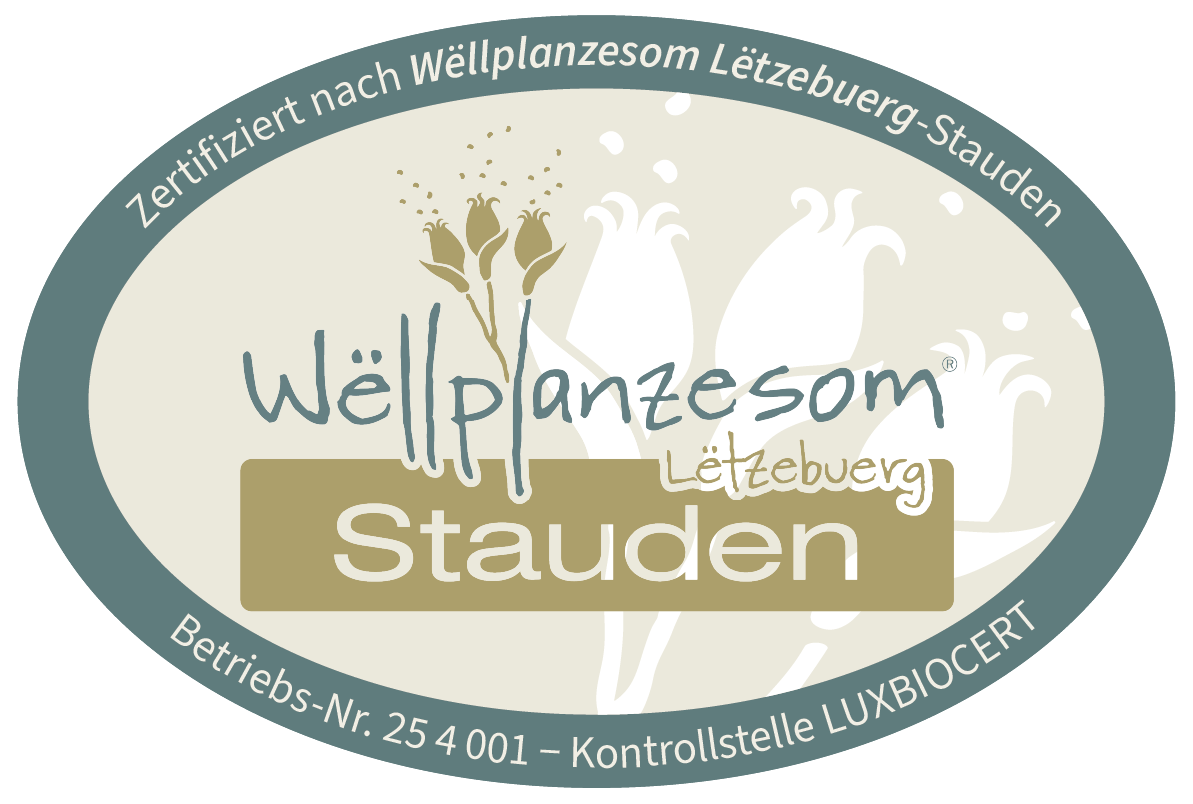 Seit 2025 werden im Rahmen des Wëllplanzesom Lëtzebuerg neben den LUX-Wildpflanzen-Saatgutmischungen auch LUX-Wildpflanzen-Stauden produziert. Das Qualitätssiegel Wëllplanzesom Lëtzebuerg-Stauden steht für gebietseigene Herkunft und eine ökologische, nachhaltige Produktion. Diese Prinzipien sind im Regelwerk der Wildstaudenproduktion verankert und werden regelmäßig überprüft. So kann der Kunde sich auf höchste Qualität verlassen. Ausschließlich im ökologischen Anbau zugelassene Pflanzenschutz- und Düngemittel kommen zum Einsatz und das Substrat der Stauden ist zum Schutz unserer Moore torffrei.